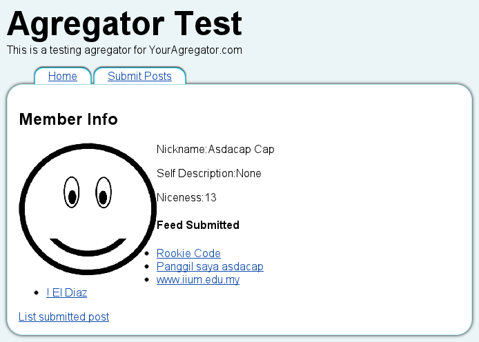If you go to the member page, you will find a very hideously incomplete-looking page. The reason it is incomplete-looking, is because it is incomplete. The reason it is hideous, is because of me. This page will show you a large smile picture, a description and a link to show post submitted by that man. The large smile picture is suppose to be a profile picture. You can edit it by going to youragregator.com instead of it’s agregator and click on your username on the top right of the screen (next to the ‘logout’ button).