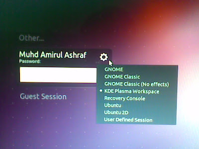 Kalau kamu perasan, saya punya ubuntu(screenshot atas sekali) lain berbanding ubuntu yang default(screenshot atas). Benar, pasal saya menggunakan K-Desktop Environment. Kenapa? Ntah, saja tukar selera. You see, dalam dunia Linux Distro(dan sebenarnya X Windows system yang juga bermaksud ***BSDs), ada beberapa koleksi program yang bila bersama digunakan membentuk pengalaman yang sesuai untuk digunakan kat desktop/laptop. Koleksi program ini dipanggil Desktop Environment. Ubuntu secara default menggunakan Gnome Desktop environment dengan diorang punya window manager yang dipanggil Unity, menggantikan window manager asal Gnome yakni Gnome Shell. Apa yang saya maksudkan ialah, apabila kamu nak login, kamu boleh pilih desktop environment yang kamu suka, dan bila masuk, desktop kamu akan kelihatan berlainan dari desktop environment yang lain.