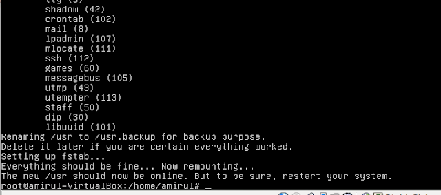 By the way, the old /usr is not deleted. It had only been renamed to /usr.backup/. Delete it manually if you are sure everything is ok.