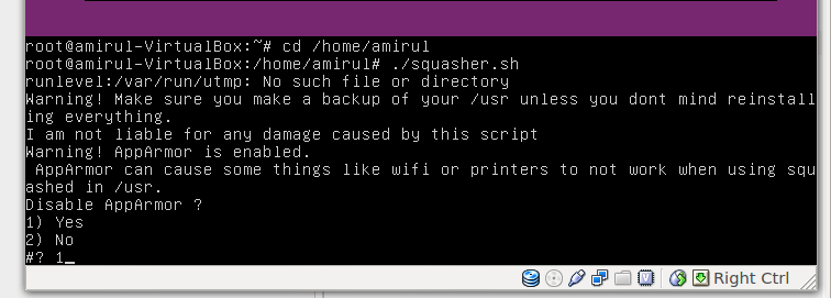 Next, it will prompt to squash /usr. The script will start modifying the system after this, so it asked you to continue.