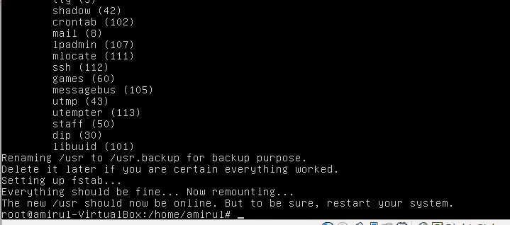 By the way, the old /usr is not deleted. It had only been renamed to /usr.backup/. Delete it manually if you are sure everything is ok.