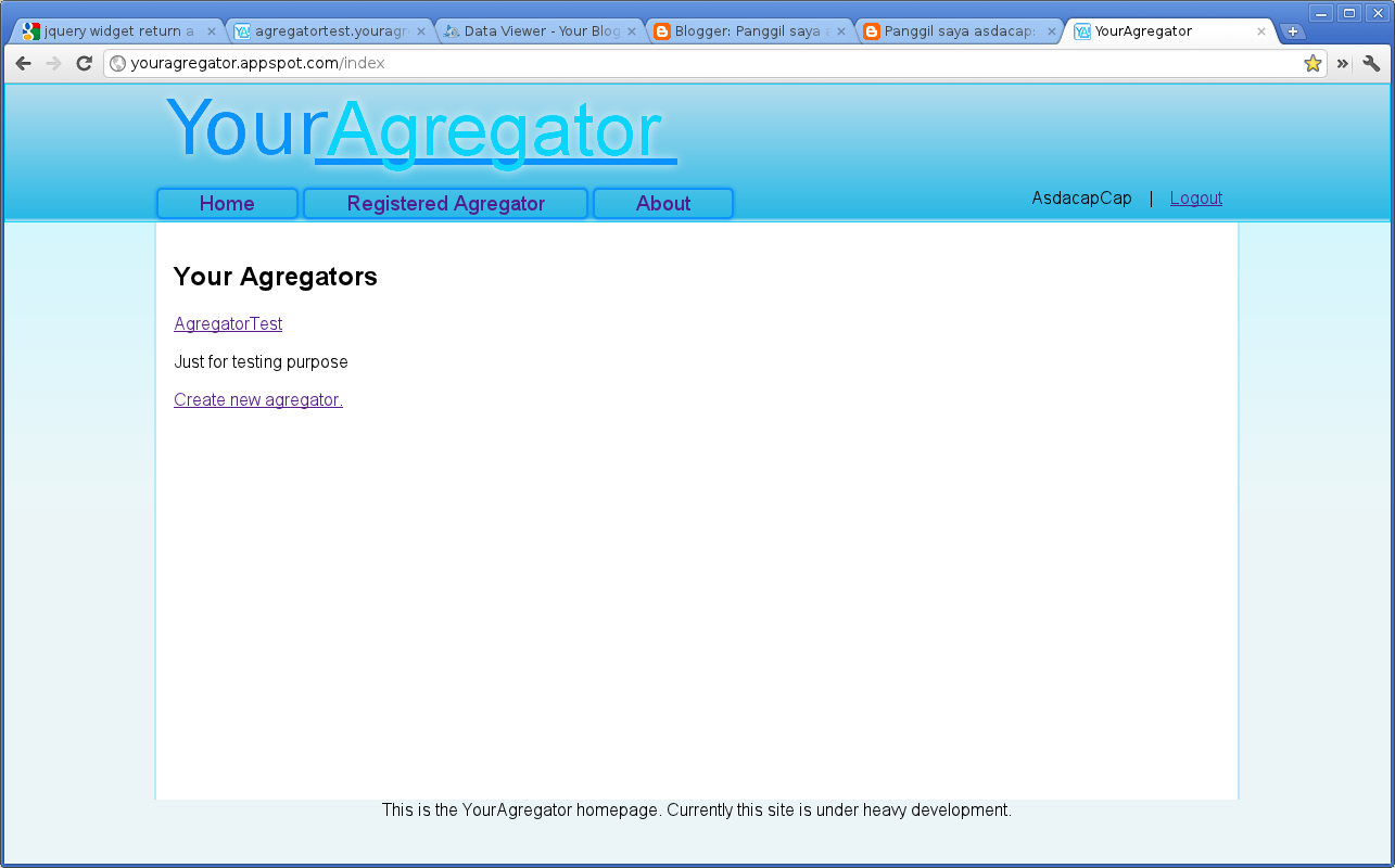 Nampak? Ya benar, perubahan ini agak besar sehingga hampir kesemua ‘view’ terpaksa di modify sedikit, kerja yang sangat leceh. Kenapa diubah? Sudah jelas, untuk memperlihatkan bahawa setiap agregator itu tidak mempunyai kaitan sangat dengan YourAgregator melainkan di host oleh YourAgregator yang dirinya di host di Google App Engine. Kenapa tak buat dari awal?…….sebab saya tak tau boleh buat camtu :-)…..Satu lagi perubahan di bawah laut, ialah setelah meneliti sistem subdomain ini, baru saya tahu yang subdomain takleh ada huruf besar… ya saya tahu, saya cuai sedikit. Dan disebabkan itu, saya terpaksa menambah satu db-indexer index untuk case insensitive comparison yang mana memerlukan agregator field tersebut diupdate yakni field nama agregator. Malang tidak berbau, saya dah set dari mula yang field nama agregator tersebut ialah primary key kepada entity tersebut yang menyebabkan anda tidak boleh ubahnya melainkan anda delete terus agregator tersebut dan kemudian buat balik dengan nama baru…. saya tahu saya cuai lagi. Dan memandangkan saya nak buat lagi satu option untuk membolehkan admin mengubah nama agregator di management interface, saya ubah primary key table agregator kepada field autonumber tambahan yang menyebabkan segala agregator yang sedia ada, fail to work….kasihan….so saya delete ajelah semua agregator dengan feed-feed yang takkan berguna kalau takde agregator tersebut. Alang-alang, saya delete aje semua database, lagipun ada 3 agregator aje, kesemuanya untuk testing purpose….